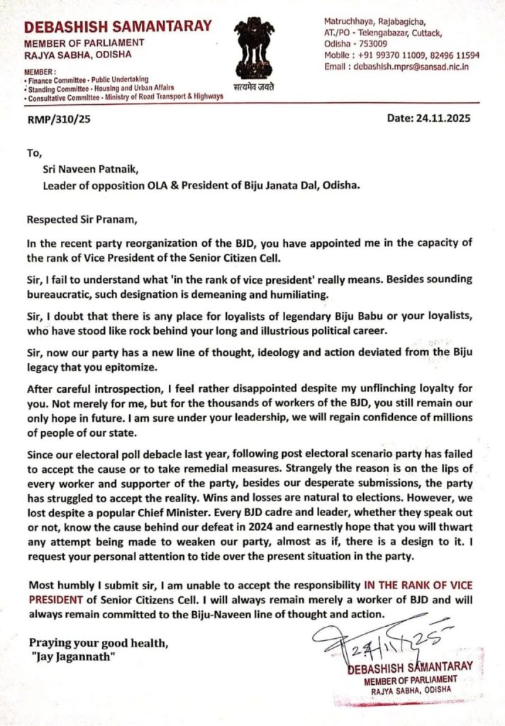 ଭୁବନେଶ୍ୱର: ସିନିୟର ସିଟିଜେନ୍ ସେଲର ସଭାପତି ପଦରୁ ଦେବାଶିଷ ସାମନ୍ତରାୟ ଇସ୍ତଫା ଦେଇଛନ୍ତି । ସେ ତାଙ୍କର ଇସ୍ତଫା ପତ୍ରକୁ ବିଜେଡି ମୁଖ୍ୟ ନବୀନ ପଟ୍ଟନାୟକଙ୍କ ପାଖକୁ ପଠାଇ ଦେଇଛନ୍ତି । ଏହି ଇସ୍ତଫା ପତ୍ରରେ ଦଳ ତାଙ୍କୁ ଗୁରୁତ୍ୱ ଦେଉନଥିବା କଥା ଉଲ୍ଲେଖ କରିଛନ୍ତି ଦେବାଶିଷ । ନବୀନଙ୍କୁ ଲେଖଥିବା ଚିଠିରେ ଦେବାଶିଷ ସାମନ୍ତରାୟ କହିଛନ୍ତି, ଦଳର ପୁନର୍ଗଠନ ବେଳେ ତାଙ୍କୁ ସିନିୟର ସିଟିଜେନ୍ ସେଲର ଉପସଭାପତି ପଦ ଦିଆଯାଇଥିଲା । ହେଲେ ଏହି ଉପସଭାପତି ପଦର ରାଙ୍କ କଣ ସେ ଜାଣିପାରୁନଥିବା କହିଛନ୍ତି । ଏଭଳି ପଦ ଦିଆଯାଇ ତାଙ୍କୁ ଅପମାନିତ କରାଯାଇଥିବା ମଧ୍ୟ ଏହି ଇସ୍ତଫା ପତ୍ରରେ ଉଲ୍ଲେଖ କରିଛନ୍ତି ଦେବାଶିଷ ସାମନ୍ତରାୟ ।