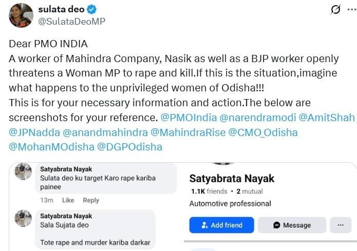 ବିଜେଡି ସାଂସଦ ପ୍ରଧାନମନ୍ତ୍ରୀ ନରେନ୍ଦ୍ର ମୋଦି, ଅମିତ ଶାହ, ଆନନ୍ଦ ମହିନ୍ଦ୍ରା ଏବଂ ଓଡ଼ିଶା ମୁଖ୍ୟମନ୍ତ୍ରୀଙ୍କୁ ଟ୍ୟାଗ୍ କରି ‘ଏକ୍ସ’ରେ ଏକ ପୋଷ୍ଟରେ ମହିନ୍ଦ୍ରା ଗ୍ରୁପ୍ କର୍ମଚାରୀଙ୍କ ଦ୍ୱାରା ଦିଆଯାଇଥିବା ଧମକର ସ୍କ୍ରିନସଟ୍ ସେୟାର କରିଥିଲେ।
